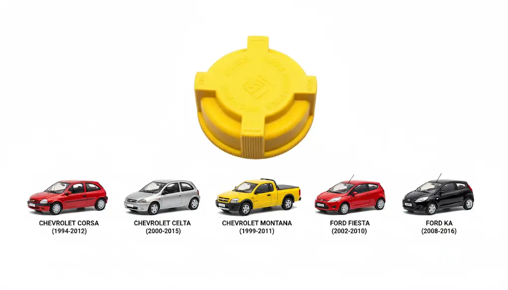 Descrição do Produto: Código Interno: 224219 Código do Fabricante: 24032 Produto: Tampa do Reservatório de Expansão Pressão de Trabalho: 1.4 BAR Cor: Amarela (Identificação Visual) Marca do Fornecedor: FLORIO Aplicações Específicas por Modelo e Ano: Chevrolet: Corsa (1994 a 2012) – Todas Versões Celta (2000 a 2015) Astra (1999 a 2011) Montana (2003 a 2015) Prisma (2006 a 2015) Vectra (1997 a 2011) Meriva (2002 a 2012) Agile (2009 a 2014) Classic/Chevy (2003 a 2015) Monza (1982 a 1996) Kadett (1989 a 1997) Chevette (1987 a 1995) Ford: Fiesta (2002 a 2010) – Exceto Street Ka (2008 a 2016) Courier (2003 a 2013) Ecosport (2003 a 2010) Informação Adicional: Produto compatível com veículos Chevrolet e Ford. A venda pode ser realizada com a marca FLORIO ou TRINK , sendo a seleção final automática e baseada exclusivamente na disponibilidade em estoque no momento da confirmação do pedido.